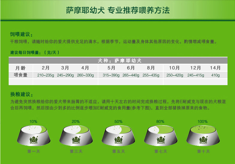 干糧飼喂,請隨時給您的愛犬提供充足的清水。根據季節、運動量及身體其他原因的變化,酌情增減喂食量。